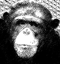 A more blubbery (unfairly) and scheming Prez Putin ...(oops, forgot one of the ears :-) South of the nose and transitioning into the mouth we have the nasal philtrum. Mr. Vladimir has one of the most well-defined philtrums I've ever seen. Watch how the highlights and shadows course over through and around it's basically recessed rectangular shape. What's a philtrum? It's the little groove between your nose and the upper lip. Since the nasal philtrum lies right n the center of the "apron of the upper lip", that allows us to segue to the "apron of the upper lip" :-) . In a side view you'll more easily notice the maxilla -- i.e. the bone that supports the nose, the upper teeth and is covered by the upper lip -- you'd notice how his juts away from the plane of his face. Those lines coursing away from and down from the sides of the nose mark off the edge of the mouth. These same lines course in a big bow-like shape down and around to the chin below. In a chimpanzee this same anatomy would be marked off by the lighter skin color around the mouth, like this: