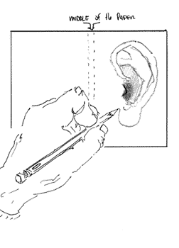 ear from memory If you're right-handed draw a left ear - (the same as the ear in the illustration.) You've been practicing left ears in all the earlier exercises, so you're going to build right on top of that. The tiny penciled in scribble at the top of the illustration says "Middle of the paper". Step 2 Here's the fun part. Draw the mirror image of the ear. That is, copy the ear you've just completed but do it in reverse. Start at the top of the drawing and work your way down. When you're done, you'll have a completed pair of ears.