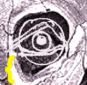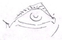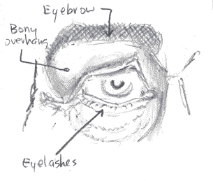 The lower lashes If you look at eyelashes from real close up, you'll see they're in rows almost like shark's teeth, which accounts for their "brush" appearance. "Brush" rather than single hairs like in the picture above. If you just make an area of shade on the edge of the eyelid, you'll often have enough of a suggestion of eyelashes to suffice. Eyelashes often bundle together and look like thick hairs. This is the effect I'm trying to accomplish in the picture below. By pressing hard on the pencil and then releasing as you quickly withdraw the pencil tip you can make the same marks. The Bags around the eyes Making sense of the "Infra-orbital" region. (Infra = below, orbital = eyes. Infra-orbital = below the eyes) the "bags". By looking at this illustration, you can see how the globe fits in it's cranial space. The yellow bracket shows the space that's covered by the lower lid, the orbicularis oculi muscle, and the "bags".