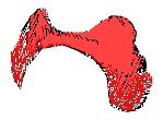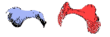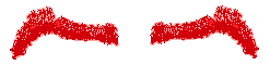 Eyebrows Let's start at the top of the above illustration. The eyebrows. The brows are graceful arcs of hair. They follow the the most anterior (forward-reaching) margin of the the frontal bone (the forehead). They're great for exaggerating, and for representing gestures. They're upside-down "U" to flat "V" in shape. They can be a very gentle "S" shape as well. Some are full and thick, some disheveled, some down right artistic in appearance. Women's eye brows are generally finer and better defined left to right. Guys have a lot more hair between the brows - and can almost have a "single" brow that spans from the left side of their head all the way across to the right side in a single swipe Women generally have less hair mass than guys, and more space between eyebrows - but this is no hard and fast rule. (My advice to you, after you give these eyebrows here a good look, is, as always, look at real world examples.) Look at these two examples of eyebrows, Rodney Dangerfield and Walter Mathau: Look at the shape of Rodney's eyebrows. And below, Mr. Mathau's - note the span of the brows: from just above the nose, curving over the eyes, then down the outside edge to almost the "crow's feet". Walter Mathau eyebrows Right now, with your finger feel your own eyebrows. Feel especially for the bony brow behind it - beneath the actual hairs (the frontal bone). Don't the eyebrows map quite close to the bone? (This works best with a relaxed facial expression.) Combining sight and touch Look in the mirror while you examine your brow. Pay attention to the information you're getting through touch (feeling the rim of bone, smoothness and pliability of skin and the texture of hair) and sight - watching your finger palpate over the arch of the bony brow, the eyebrows, all the way over to your nose. Alternate your concentration between what you see, and what you feel. Isolating the shape of the hairy eyebrows. (I'm calling these the "hairy" eyebrows so you don't confuse them with the "bony" brow underneath them.) I've highlighted the eyes a shade of red here in PhotoShop. This articulation of the portrait is called a 3/4 (three-quarter) view. Two other views you could use are profile (like in the foundation lessons "vase/face" exercises) and front view. Three-quarter view is just a view of the head somewhere between profile and front view. Three-quarter view of Here I've isolated the eyebrow's. I've added a little extra distance between them Imagine you see the rest of the face forming around these brows. Isolated eyebrows in "3/4" view Here I've made a copy of the right brow and reversed it. So in essence, you've got a pair of brows in a frontal view. In reality, most people have asymmetry from one side of their face to the other. That is, they're not mirror images of each other. We'll be doing a short section on symmetry below.) Front view of eyebrows