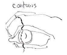 A primer on the masses around the eyes: In this next picture I've drawn some of the masses that meet at the eye: the forehead, the bony overhang, the cheekbone, and the nose. (We'll be getting onto the masses of the head very soon - so this is just a tiny intro): Locating the edge of the brow In this picture, I've circled and placed an arrow over the area of the right* brow. Notice how the forehead peaks at the eyebrow and then recedes back towards the eye? And the cheekbones rise out beneath the eye? (* I use left and right relative to the left and right of the face being looked at in the picture - in the way the picture would describe it's own eye. This how medical people - doctor's, PA's and nurses - describe left and right: always in terms of how the patient would describe the part: "my right eye" in this case).