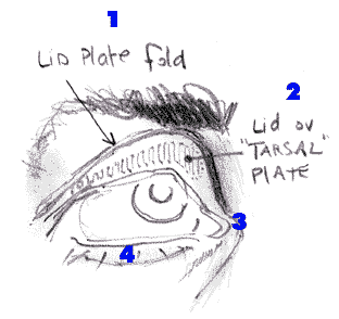 Hopefully you're coming here directly from part one. If so this picture will make sense. In part one you saw a quick view of the skull, the eyeball, and a few of it's muscles. In the illustration directly below, you'll see the bony orbit is outlined and grayed out ("rim of bone"). It would be window into the skull if the eye wasn't there. You can also see the spherical outline of the eyeball itself in white. And, what's new here is the roughly triangular overlay of the eyelids - more accurately, the opening between them - placed over the round eyeball. (The heavy pencil line.) The bony orbit, the eyeball, and lids. The Eyelids and Lashes Around the eyes you have an upper and lower lid. Inside both lids is a tiny cartilage called the "tarsal plate". It's just beneath the skin in each lid, it's narrow and goes left to right under the entire lid width-wise. It acts like a curtain rod of sorts: it adds stability to your lids and allows them to open like a garage door i.e., they enable your lids to open or close all in one piece. I only mention them because they allow your lids to open under the overhang of the brow in a "sleeve-like" fashion.. "Sleeve-like?" you say? Well think of it like this: each section of a telescope slides into the one behind it, right? Into the larger section? That's "sleeve-like". That's just what the eyelid does when it opens or closes - it rolls and unrolls up under the brow. (It's more profound on the upper lid.) Detail of the eye lids