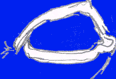 New: Drawing the Eyelid as Negative Space Approaching this as a negative space drawing. These lessons are based on the idea that every one can learn to draw: we all have the capacity to see as an artist, we just have to step by step recover our innate ability to use the artistic mode of our brains. Like all the other exercise you've done, this one is designed to gently prod you into R-mode: your own real time, inborn artist-in-residence. Here's an Eyelid. You've seen it in the two exercises before this, so I'm sure it's looking pretty familiar by now. (And that's kind of exciting: you're recognizing and feeling familiar with the anatomy. Great job!! Pat yourself on the back.) I've got it surrounded by a rectangular format. Before you scroll down the page to the answer, try and identify the negative spaces in this illustration: Can you identify the Negative Spaces? Think of the negative space around the lid as all the parts that are "not eyelid". That is, anything else: the brow, the actual eyeball, the nose, the cheekbone, the space between the lid and the format - all are negative space. Look at the next picture. It'll make it pretty obvious where those negative spaces are.... The Negative Spaces around and in Eyelid There's some shading in this picture that's a little distracting - it'll be clear below which is which. You still ought to be able to demarcate "eyelid" from "not-eyelid". Next we'll do this with the pupil and iris. But first I want you to pick up a pencil or pen and pick out right here on the screen the negative spaces surrounding and within this part of eye anatomy: Point out the Negative spaces with a pen or pencil Now that you've done that, take a look at the next illustration and see that you've correctly identified these areas. Negative spaces around the Iris and Pupil Did you pick the right spaces? Piece of cake wasn't it? I want you to notice something here. See the single cross-hatched areas immediately around the pupil? That's the "main" negative space in relation to the iris and pupil. Recall in the Nose: Negative Space exercise I touched on the notion that anything could be treated as negative space? Well the double-crosshatched area around the almond/triangle shaped part of the eyelid margins is a negative space in relation to the almond/triangle shaped opening of the lids. Does this make sense? Let me say that a little differently. If the pupil/iris is your focus, then the "non-pupil/iris" space around it is all negative space in relation to the pupil/iris. If you consider that space, the "non-pupil/iris" space as the main object, then the space around that (around the "non-pupil/iris") becomes the negative space (as does the pupil/iris). It will be a great advantage for you to get good at shifting your focus. Why is this a good skill to have under your belt? When you can shift back and forth like that, any troublesome spot becomes easy to draw - because you can now draw the troublesome area indirectly by drawing the spaces around it.. We're going to draw the eyelid again: this time by drawing nothing but the spaces around it Step 1: Draw yourself a format or download/print the formats for each part of the ear. It doesn't have to be perfect - just rectangular, taller than it is wide. You can reference or print the formats below if you like.(Note: recall the format is the shape, the frame around your drawing, within which you'll do your drawing. Any questions, review the illustrations in the Formats section of lesson 6.) Step 2 Center your attention on the negative spaces. They may be within the object, between objects, or they'll exist between the object and the boundary of the format. (Refer to the picture if necessary.)