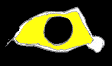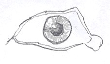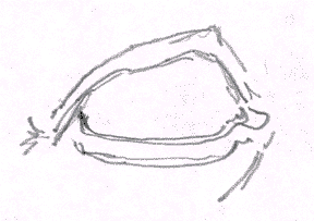 Again, by refocusing your attention to a different shape within the composition, the areas around it can become "negative space". Focus on the shape between the format and the pencil line (representing the margins of the eyelid) until you appreciate it as a separate shape. Step 5 Now, stare at one of the shapes. Keep looking at it. Gaze at it until you feel it to be real shape - as substantial as any object on the page. Gaze at it the way you looked at the vase-face, (lesson 2) in the earliest lessons. Remember how it shifted back and forth from vase to face? And when it "popped" into either the vase or the face, recall how it suddenly was one or the other? Remember how that felt? You're working for that same effect here. Be patient, it may not happen instantly. It'll take L-mode a second to realize it's got no name or category for this thing - so it'll want to scan it's banks for some kind of association. Let it do what it has to. Eventually it'll get frustrated and allow R-mode to take over. And that's exactly what we want. Step 6 In this last step, repeat steps 1 - 3, and step 5 (4 is optional) for the pupil and iris. Then take a break! Draw this for step 6 Go to the next section on applying the technique from "Vase/Face" to the eyes. It's not nearly as long as these first sections and it sets you up for a really fun exercise: cartooning the eyes. In this next section, you'll be concentrating on doing both left and right eyes. Up to the is point, all you've been drawing is right eyes. "Vase/Face" for eyes: Drawing left and right eyes Kasbohm & Company's YouCanDraw.com © Copyright, All rights reserved 1997 e-mail: jeffkaz@YouCanDraw |