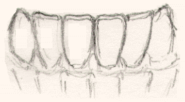 #4. The Incisors Why is this important? (i.e. recognizing the gums.) Because, in drawing terms, the gingiva and teeth share an edge. (See Lesson 4 if you have any confusion about lines and shared edges). And if you drop into "r-mode" for a moment and draw the negative space of the gums and add the line between the teeth, you've drawn over half the tooth without even trying! Just like in 4a: