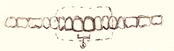 1) Draw the maxillary incisors. With tracing paper, trace illus. #1 right off the screen or click here, (for a printable illustration). Print out the teeth and hold them against a window and trace over them on to ordinary paper. Draw a line between the middle of the incisors or cut your tracing paper in half and and re-draw each set of 8 teeth (half set of teeth). So now you have a left side and a right side, like these two illustrations: