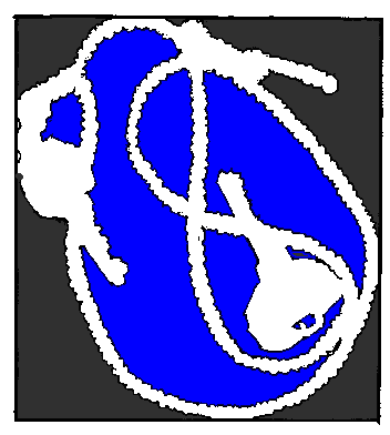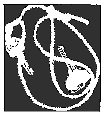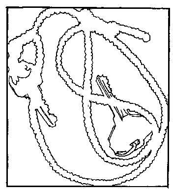 Draw the "negative spaces" around the objects. (For reinforcement: see the jigsaw puzzle example where the sky was as real as the sail of the boat. In a jigsaw puzzle, the not-object spaces are as real as the object. Think of the negative spaces as being that substantial - like you could almost cut them out of a plywood plank and hold it them your hand.) A finished negative drawing of the keys and braid in the first illustration looked like this (there's a little extra detail on the keys): A negative space drawing of the first illustration Step 6 Now color in those spaces with a colored pencil or a marker like they're shown in these examples. Coloring these in, makes them more real, gives them more weight, convinces your mind of they're realness. Color the negative spaces with a marker or pencil Enclosed Spaces Here's a distinction I'd like you to notice. There's spaces between the objects, within objects, and between the objects and the format. I want you to concentrate on the spaces between objects and within objects. The spaces within the objects (like the "eye" in the key where you loop the key ring or chain through) and between objects might be open or enclosed. The "eye" of the key is enclosed. Most of the spaces between loops of string are enclosed. The areas colored blue in the illustration below represents enclosed negative spaces. Recognizing the enclosed spaces will help you visualize negative space on more "complicated" objects like in faces or caricatures. (If you came here from lesson 7, and want to return.) The enclosed negative spaces are colored blue. Step 7 Now, stare at one of the shapes. Keep looking at it. Gaze at it until you feel it to be real shape - as substantial as any object on the page. Gaze at it the way you looked at the vase-face, (lesson 2) in the earliest lessons. Remember how it shifted back and forth from vase to face? And when it "popped" into either the vase or the face, recall how it suddenly was one or the other? You're working for that same effect here. Be patient, it may not happen instantly. It'll take L-mode a second to realize it's got no name or category for this thing - so it'll want to scan it's banks for some kind of association. Let it do what it has to. Eventually it'll get frustrated and allow R-mode to take over. And that's exactly what we want. How Play-Doh and the Road Runner can help You visualize Negative Space. Remember the old cartoons where Wiley Coyote would chase the Road runner at breakneck speeds around cliffs, over cliffs, and off cliffs? And remember the impression the coyote would leave in rock walls and in the canyon floor as he would rocket in to them? Remember the cookie cutter-like outline of his body left in stone? It's that outline, the outline of the coyote that's formed in the rock - that's analogous to the negative spaces you're learning to recognize here. Shared Edges Think of the outline of the coyote one more way: the outline of the hole left by the coyote shares an edge with the inside of the rock. If you now draw the rock, you draw by default, the coyote. One last analogy: Play-doh. Picture in your mind the old Play-doh "cookie cutters" where you forced Play-doh through a cookie cutter shape squeezing out heart or moon shaped pretend cookies. The edge of the Play-doh shared the edge with the cookie cutter. If you traced the cookie-cutter form, you end up drawing the star or moon or heart shape by default - like a stenciling form and a stenciled drawing. Two more drawings When you're finished with your first object, go right to the next one. Follow the same steps as you did above: