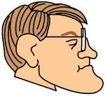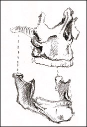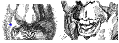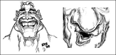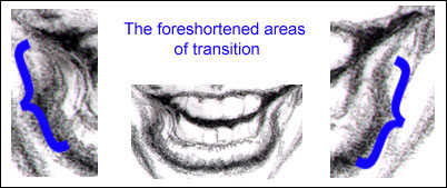 The little bundle and dimple of the chin is caused In a profile view like the cartoon just above on the right - the mentalis gives up it's share to the "jutting" of the chin, but the length of the jaw is the more important contributor. When you're drawing it's important (though not necessary), to know what causes the shadows of anything you're drawing - even if it's a very subtle influence. Yes there are other muscles at work here like the muscles that run from the corner of the mouth to the chin (like the triangularis), that make a contribution, but you can look at the section on anatomy (upcoming), to see more. You don't need to be overwhelmed nor bored with all that right now. Just know that to make really accurate portraits or even caricatures it can really help to know what's going on below the external surface of the face. Why's that? Because you can actually predict how a face will contort or change with a given expression. ( back to top ) 7) And yet another: the