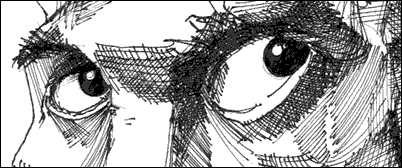 (Reminder: you're seeing Ani's eyes in detail here. Everybody - and just about any animal with a backbone - will have these same in-depth details.) Ok. That's a fair amount of detail. You can go back to the section on eyes (Lesson 12: Drawing Eyes), if you want to research the eye more. Shadow shapes We're now going to switch gears and look at the shadow shapes of the eye and specifically at the shapes of the folds under the eye lids. Like any feature of the face, these - the shadowing and the anatomy they convey - can be fertile ground for exaggeration. One word to be remembered for this section: SQUINT! Ready for something new? This next set of illustrations will focus on shadow shapes in and around the eyes. Many beginning artists (me included), draw or drew the obvious stuff: the almond of the eye, the eyebrows, toss a nose in between them etc., but failed to see the real defining shapes, lines, and contours between simplistically drawn or "bare bone" memorized features. So what are these "defining shapes"? What are they and how do your draw them? To answer the "what are they?" question, they