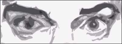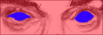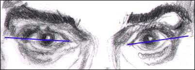 the whited-out basic outline of each Again, the eyelid margin is the very edge of the lid. In the picture above the eye has been erased and the lid margin is more exposed. Though the eye at the picture's left may be cleared out a little less than completely, it's still of a slightly different shape than the other eye. Even so, look at the difference of shapes just going eye to eye on the same person.