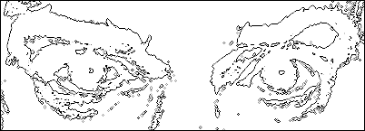 Next drawing: on a separate piece of paper, with or even preferably without your own home made grid lines, try to duplicate this next complicated drawing. Hint: draw a rectangle on your paper first. And make sure you draw it the same shape as the rectangle around the picture. It will serve as the format (the container) you draw within. If you just have to know what this is before you draw it, click here . (Before you do that, let me remind you, the brain finds things it can't name much easier to draw.) But self restraint is a virtue. C'mon, do the drawing first. ;-)