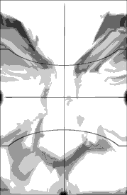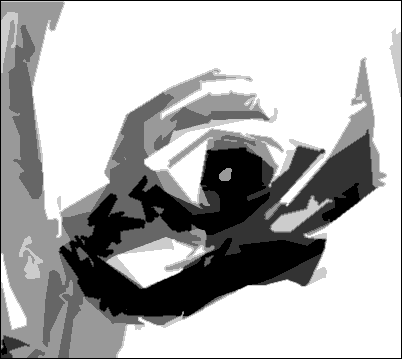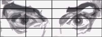 In this next exercise, you'll be drawing the shadow shapes. The goal here is to see the the unique shapes as just that: as shapes - as more than just lines as you did above. These correspond to all the shadow shapes, highlights and different line-shapes formed by the different tones of gray. Click on the "Contour Grid" link below and draw this "five tones of gray" version on a blank grid. Pay special attention to the shape of those lower lid and infra-orbital fold shapes. Pay attention also to the different tones of gray as well. Then take a break and commend yourself on having the courage to really dive in. I'm proud of you.
