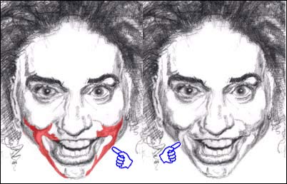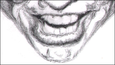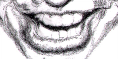 Take a second and try to perceive just the blue shadow shape and a few of the gray shapes that surround the teeth. Squint - this almost always helps, especially when you're drawing from photos or pictures. Focusing your attention on just those shapes outlines the overall positive form of the teeth. Did you do that? Go on, give it a whirl!