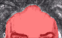 Two ways of looking at the hairline: 1) Way one: as the face disappears into into the hair (focus on the red tinted transparency as the primary overall shape the face presents us with):