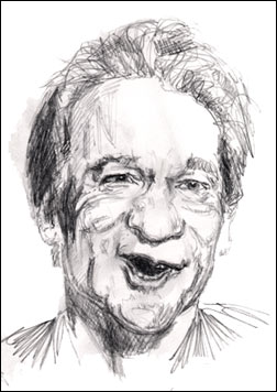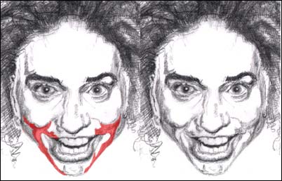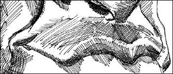 Can you see two levels of shadow? Try and perceive two levels of shadow: the very deepest shadow and an intermediate color of shadowing. These are a mixture of shadow and reflected light. Under the chin and over the neck is another area of subtle contour. It's the shadows in these areas that give the brain the needed information to perceive the three dimensional shape revealed by the shadows. Identify these different shadows in this next illustration of comedian Bill Maher (for more light and shadow explanation see Lesson 9: Light and Shadow ):