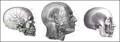 Next time you encounter a man with a totally bald head, unobtrusively note this landmark across the forehead and along the sides of the head. You can actually see the muscle contracting while you eat. Again, if you note a really bald guy at a restaurant unobtrusively note the action of this muscle. You'll see it working. Or less obtrusively, watch Star Trek and you'll see that bald commander guy with the same landmarks and visible muscle and jaw action. [This muscle origin* adds to the subtle, elegant and