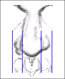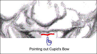 Before looking at the mouth and teeth, let's take a very short little tangent through the area known as the "apron of the upper lip". Did you notice this: when it's shape is highlighted (the way it's highlighted in red above), it's shape becomes very recognizable? It's comprised of or contained by the following: