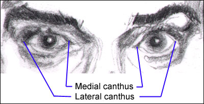 each eye What angle does a line drawn from canthus to canthus form in relation to vertical and horizontal? Recall what you read about women having more of a "cat eye" look. What's that mean? Basically it boils down to the angle of the line drawn from medial canthus to lateral canthus through each eye. What about on the color photograph above? (It's not Ani by the way.) What other differences can you discover? How would you caricature the eyes you see in the color photo compared to how you would caricature Ani? What angle line is formed when you draw a line from medial canthus to lateral canthus ?