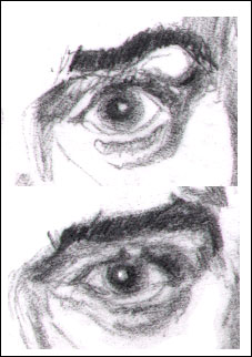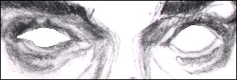 Your job now is to focus on all the different shadow shapes outside the actual eyes. This includes the eyebrows, the shadows between the two eyes and on the side of the nose, and the shadow shapes below the eyes: (these are shadows defining the infra-orbital folds). Find these in the two pictures above. "These? What are these?" you say...yes, these are: