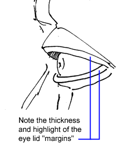 E) So much for the canthus of the eyes. You're familiar with the upper and lower lids. That's pretty straight ahead. But what I want you to take special note of is the thickness, the substance of the lids and especially the margin of the lids. (The margin is the edge.) Why? Because often the margins have a highlight attached to them or they form a bare spot between the actual white of the eye and the place where the eyelashes start. Look close and you'll see them.