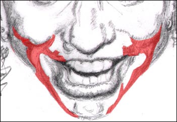 A review of the muscles that help form amongst So to run that by you one more time and say it in a slightly different way, the cheeks get puffed up when the zygomatic major and minor, the naso-labii levators (lip lifters), and the orbicularis oculi all pull up and out the corners of the mouth in the direction of the temple. These bunch up the fat layer that you saw in red just above. The triangularis and a couple other muscles on the chin and neck pull down and away (in opposite directions) from those muscles I just mentioned. These add lines of stress along the sides of the mouth that travel almost to the chin like those pointed out in this picture: