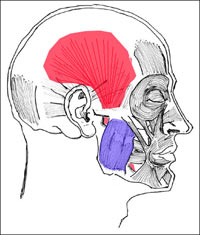 the temporalis muscle grows out of the cranium and inserts on the jaw bone.
