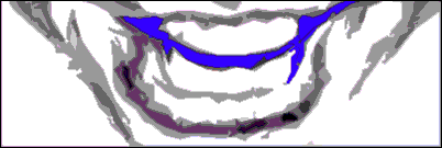 Pretty fascinating in it's elegant simplicity. Onward. Next topic: the mouth, lips and teeth 4) Ani's lips, mouth and teeth You can't talk about the apron of the upper lip without talking about upper lip proper and the rest of the mouth, so lets look at those here. This has been mentioned in earlier sections: that Ani has a full lower lip and a beautiful "Close-up" smile toothy grin. ("Close-up" as in "Close-up" brand toothpaste.) In cartoons the mouth and lips can be drawn in a minimalist fashion like this: ...simple lines sufficing for lips, mouth, and apron of the upper lip. It's amazing that with so little detail you can generate so much personality. But in realistic renderings, you've got to be more observant and report much more information. For instance, if you understand what's going on under the lips, literally under the skin, you'll see more and thus portray more when you draw them. It's simple - but complicated. Let me take a stab at it.