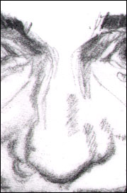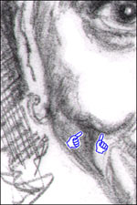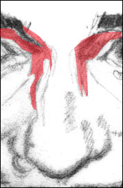 The root of the nose, the bony C) Don't look ahead now. Right, like that's going to stop you (and don't think of the color blue :-) Just keep cruising right on down the page here. I want you to identify the groove of the upper lids - this one's a little harder to identify because the pencil gets a little thinned out in this scanned pencil drawing: