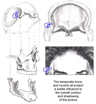 The forehead and it's main masses Of course the bones - the frontal part of the cranium - are the greatest contributor to the mass of the forehead. It's the underlying musculature that accounts for much of it's subtle shadowing, wrinkles and expressions, and of course influence it's final, drawable forms. The main area of forehead shadowing and contour are pointed out in this next illustration (remember to squint your eyes to collapse the shadow areas into more unique, definable shapes):