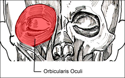 Muscles around the eye You can see in this picture the main muscle that surrounds the eye. Yes there are other muscles but this is the most important one. It's lower third is also a large contributor trot he thickness of the folds under the eyes. Other contributors: the actual skin, the layer of fat under the skin and the amount of fluid in the body. All will be reflected in by the infra-orbital folds. The muscles that control the eyebrows
