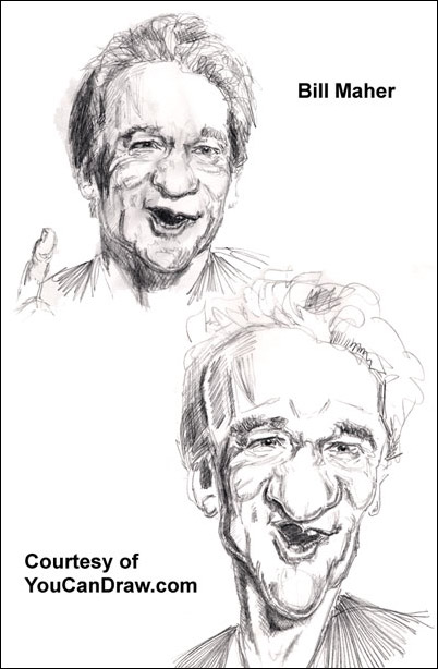 | March 23rd 2001 (picture at bottom) ************************************************************* Your Every Other Week Caricature Complements of YouCanDraw.com ************************************************************** Howdy all! Today's Caricature is of "Politically Incorrect" talk show host and comedian Bill Maher. Has he got a caricaturable face or what? We'll get right to it and run rapidly through the different highlights: I think what's most characteristic of Mr. Maher is the nose, the mouth and the flaming red hair. In that order. (Course it's hard to tell he's got red hair in a pencil.) That's what grabbed me any way. More details.... The Shape of the Head: The Head is broadest at the top and the nose is broadest at the bottom and: which makes for an interesting contrast. Mr. Maher has a "light bulb" shaped head. His "foofed up"hair accentuates that look even more. The Nose The nose as - just mentioned - is broadest at it's base (remember the root of the nose is up there at the level of the eyes). More than being just broad at the base, Mr. M's nose fans out like a yard rake (I don't mean that disre sepctfully at all - just a visual analogy). The Mouth The mouth is interesting in the way it tilts just a bit of to the side - the asymmetry is evident when he talks too. This is a neat find in a subject: asymmetry that is. The lower lip is full, and by adding shadows and highlights in the right spots make it jump out. Also notice the sharp curve of the lower border of the upper lip - I thought this little accent was a key to getting his look. It's got a sharp point right at "Cupid''s Bow" - that's the very center lobe of the lip. The Eyes I left the eyes farther down the list but they're mentionable in that he has very black pupils that jump off in contrast against the light eye brows - which are on the thin side and are light in color. The Neck Not a lot of detail, but be aware at how in men the Adam's apple always has a distinct shadow shape attached to it. Also notice that giving a "pencil neck" look accentuates the narrowing trend from wide at that top of the head to the thinning neck. I think it starts to get pretty hilarious. (Well that's just my opinion any way...I laughed after I drew it. :-) Link for original pictures: http://www.netcrusader.net/~olsens/pi/photo_gallery.html So have a great weekend and keep on drawing. Warmly, Jeff K.