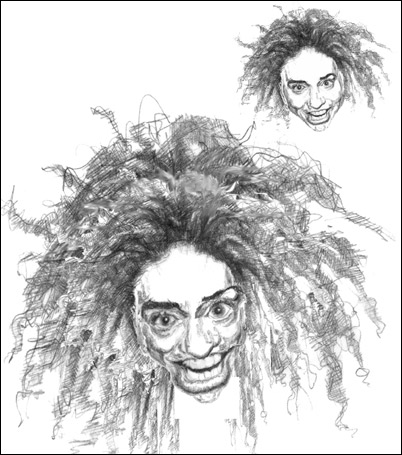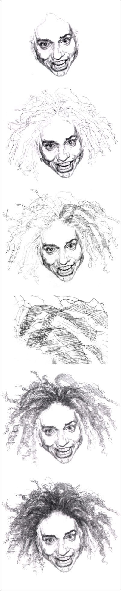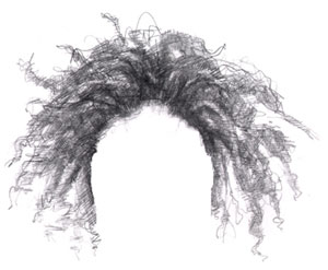You also need to weigh hair color. Blondes get by with much less hatching. Afro-hair is made up of lots of tiny curls so using what kind of lines do you think would work for this kind of hair? Three guesses. Yes, tons of teeny tiny curls is both realistic and effective - with or without hatching too.