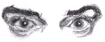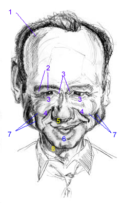 We also saw in Part II how we've really been building our visual vocabulary: We named things. We considered the point of view that the real key to drawing great caricatures as well as great portraits was knowing what to look for and that by having a name for it, you can actually look for what you've got a name for in the first place. "You'll see it when you believe it" rather than the reverse. Which lead us to the question: "is there anything here exploitable?" Of course we're always asking that. :-)