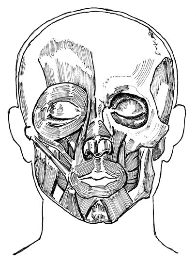 This is one of those stiff looking but strangely interesting anatomic illustrations. Facial musculature and facial expressions are pretty fascinating having roots you can follow all the way back to the days of the dinosaurs. Think of the facial muscles like this. Ever seen one of those modern double layer tents? Yes, tents - the kind you take you when you go camping. The kind where there's a base tent and then there's this wind guard layer that mirrors the main shape of the underlying main tent? It kind of floats over the "real" tent. Well that's how the facial muscles work: they more or less float over the underlying bones.
