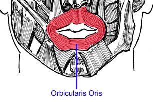 The origin for the five labeled facial muscles above is bone. Specifically the bone of the forehead and cheekbones. Now check this out. The cheekbone is called the "zygoma", and it just so happens the two muscles who's origins arise from the cheekbone are called respectively the "Zygomaticus major" and "Zygomaticus minor". Imagine that! Now doesn't that make it easier it remember? When a muscle contracts, the muscle shortens in the direction of it's origin. The insertion gets pulled towards the origin. The insertion point we're concerned about on our little tangent here is the insertion of these five muscles into the tissue and actual muscle around the mouth. All five of these muscles attach to that muscle and tissue. So, getting to the point, when you smile the overall tug on the mouth is up towards the nose and out towards the ears.