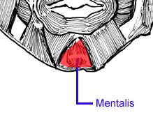 Try this. Place a finger on your chin just under your lower lip. Now whine like a dog. Yep, go "hmm hmm hmm" the way a sad puppy dog would. Think "frown" at the same time. You'll feel the mentalis pull right up to your lower lip. Feel it? That's the mentalis doing it's job. I think the name comes the expression a person makes while he/she is thinking too hard. Ya know, like Socrates going "Hmm, should I drink the hemlock and die or should I tell a big old fib and live to be old and miserable?" I just know that's where that name came from. Had to. You can quote me on that. :-) Now that you're frowning and shaking your head, you can