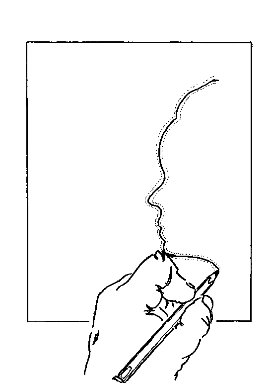 Lesson 1: first step of drawing the vase face This is how this'll look for you left handers. Not to worry, Right- handers got to go to a second picture for the next illustration. If it's any consolation, I'm left handed too. Drawing the vase/ face left handed. These drawings here to make the exercise clear, but you'll get the full effect of the exercise if you draw a face from memory. Why? Because it gets you to tap your own stored version of a face, that is, your symbol for a face. And that's an L-mode function. (It's alright if you want to print the half-done examples if you want to. You'll still experience the shift.) |