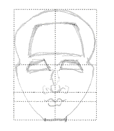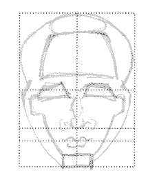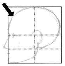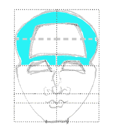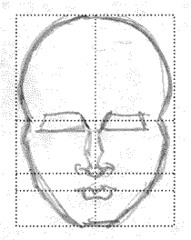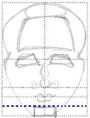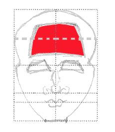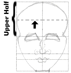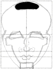 So guess what? You get to add the four parts you saw in the "gif" animation: the crown, the forehead, the chin, and the cheekbones. I'll break it down for you here and then you'll jump right in. First adding the forehead First we'll put in the forehead: I'm not going to give you any fast and hard guideline on the forehead for Mr. Average - people's hairline obscures or exposes it so much. I will say this much though: if you split the upper half of the front view format in half again, and draw the "trapezoid" shape of the forehead centered over that line, you'll have a good feel for it. Just like this: 1) Splitting the upper half of the front view format in half again with a dotted line (the arrow points out the line): Splitting the upper half in