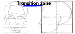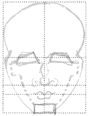 Both pictures have proportionally the exact same format (the size of the format containing the front view with masses is a little smaller). Both illustrations have eye lines that are at dead horizontal center; both have a base of the nose line that divides the lower half of the format in half again. Both have a lip line that marks off the first third of the bottom quarter of the format. There are a few more angles to the face at the left, (like an added angle of the jaw, a rounder cranium) but essentially they're very similar pictures. Proportionately they're roughly the same. Notice however how the face on the right has so much more depth to it. Do you get the feeling that light is reflecting up against the cheeks? That's only an illusion your brain is inducing - the side of the cheeks are no more intense white than the front of the cheeks. The heaviness of the actual pencil line adds a lot to the feeling of distance and intensity too (the relatively thinner, outermost line in the "masses" picture adds to that illusion) - but we're not going to worry about that right now.