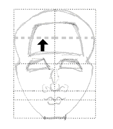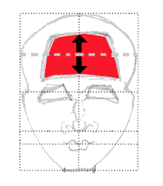 Visualizing the center of the forehead The forehead straddles the middle of the upper half of the format. Those black arrows in the next illustration are the same size, I just flipped them to show you graphically that the area of the forehead above the dotted line is about the same as the area below it: Switching into "Negative Space mode" And as usual, let's compare the different masses of the forehead and the masses surrounding the forehead by switching into our "negative space" mode. We'll treat the forehead (the red) as the object in the left hand illustration (a), then we'll look at the space around the forehead as the object (the blue) in the right hand illustration (b):
