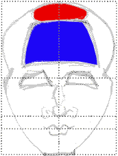 Transition of the forehead The arrow here marks the dividing line between the forehead and the crown. The crown, in a side view, is just the curve of the top most part of the cranium. It's usually hid by hair so you're not always readily conscious that there's something solid there. (Unless of course you're one of us hombres who don't have the luxury of all that natural covering and are all too aware there's something solid underneath.) The next small illustration shows that transition zone (the blue line) between the front and side views. Also note that the eyeline, the base of the nose line and lip line, all line up perfectly: