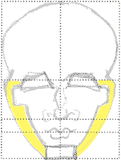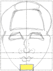 Next add the chin We jump next to the chin: all you do here is fill the bottom one third of the bottom quarter of the face with a rectangle. The lip line as you recall, falls one third the way down, (i.e. one third the way down the distance between the nose and the bottom most margin of the jaw - all this fits into the bottom fourth of the face). Teeny review. The base of the nose line starts on the top of the bottom quarter of the format. So if you divide the bottom quarter of the format into three equal horizontal parts, it'll be snap to construct a place for the chin. One third the way down marks the lip line, two thirds the way down marks the chin line (in blue below). Finding the line to mark off the chin: Chin at the 2/3rds line The top of the chin line starts two thirds the way down the bottom quarter of the format. In the next illustration you can see how a small rectangle will suffice for the chin: