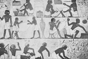 Distance in early Egyptian art is represented by relative height: whatever is closest is in the lowest portion of the picture. Highest is farther away. This is similar in idea to the Oriental example, except the Oriental technique is more realistic. In fairness to this piece of art, there's a story being told here. It's told in a linear sequence much like comic strips of today are: the picture that comes before the next came first in time. Of course you have to know what direction it's meant to be read in. In the West, it's left to right. Storytelling or not, in Egytian art where distance needs to be conveyed, the technique used to display distamce or depth would be exactly the same as in this picture: the more distant, the higher vertical placement in the composition. Back to where I found this link in Lesson 8