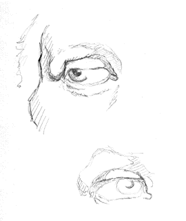 1. Introduction: Lesson 12 Drawing Eyes As usual, you'll find some background anatomy here. You'll see where the eyes fit in to the incredible architecture of the face and head. New Stuff! -- make sure you check out this page in the "From the Top" section of the Archives: Drawing Eyes An extension of the introduction, you'll explore more of the fine detail of the anatomy of the eye and features around the eyes. You'll learn about things like the "tarsal plate", the "canthus" and the "caruncula" to name a few. These will help you identify these when you begin drawing others. Taken piece by piece, you'll learn and learn to see all these details in your subject's face. Here you'll start with the three most circular parts of the eye and build outward, bit by bit adding to your awareness of the depth that surrounds each and every eye. 4. Eyelids Working out from the middle of the eye concentrically, the eyelids become dynamic and expressive parts of the eyes. You'll learn about them here in their simplest form and then build on top of that. 5. Pure Contour Example of the eyes. As you've seen in the other exercises, modified contour is your first step in getting into R-mode - repetition equals practice, and practice makes perfect. Modified contour is the first step in restoring accuracy into your drawings. Here you'll use it for your first detailed drawings of the eyes. 7. Negative space drawing of the eyes. This is a lesson in seeing the spaces around the eyes and lids as well as a lesson in deepening your flexibility in viewing adjacent shapes - you'll be flip flopping between what's viewed as object and "non-object". You might just realize how arbitrary it all is. 8. "Vase/Face" of the eyes: drawing left and right eyes. Don't skip this lesson! This is an exploration in both mirror images, and in deepening your R-mode access through practice. 9. Adding the finishing touches to the eyes Part I. Adding gravity, injecting three-dimensions in your two dimensional drawings - these are the kinds of things you'll learn to add to your eye drawings in this lesson. Ever looked close at the bags under a person's eyes? Ever seen the tiny X's in the wrinkles around your own eyes? (Do you feel a little resistance bubble up at thought?) Details like these are at the core of a person's expressive character. You'll learn to start looking for the patterns in those details in this section. Moving on to the next set of facial features: the lips and teeth. Kasbohm & Company's YouCanDraw.com © Copyright, All rights reserved 1997 e-mail: jeffkaz@YouCanDraw |