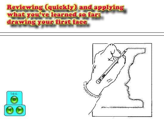 you've learned so far In this lesson you'll get a quick review of the skills of drawing you've been exposed to this far. Repetition, repeated exposure, rehearsing again and again what you've been learning will help you pull the draw string back farther and sending you farther and farther into the artistic landscape and closer and closer to your goals. After the review you'll learn some basic facial proportions and then do a drawing of a face in profile. Click on the picture just below for the accompanying Flash lesson (Note: If you're accessing this on-line, go to the Flash link center in the upper right hand corner of the Archives page.): Note: Due to the way the Flash Lessons are constructed and due to limitations within Flash technology itself, the links contained within the interactive lesson point to the online book (links of the "http://www...." type). All the same pages those links are aimed at are within the book in front of you. For your convenience, the links contained within the Flash Lesson "Drawing Your First Face" are repeated in their order of appearance within the table below. (Specifically the right half of the table - just read the headline for each column :-) Further, they're linked to the book as it sits on your computer - they won't open a browser and you don't need a web connection to open them. What a deal :-) If you want to see if any new additions have been made to the online page, go for it and click on the links within the Flash Lesson or click on the links in the left hand column below. If you want to access those pages rapidly, refer to this list: