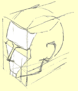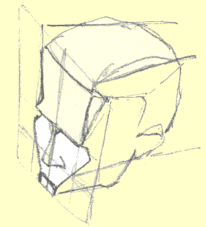 bead on the vanishing point and the perspective of the overall head shape. Now why are we going through all this? For this reason: To draw the head's overall shape, as you saw in earlier sections of Lesson 14, we whittled down from a cube-like block of wood and whittled away until we had the basic block shapes of each section of the face. By getting everything molded into cube shapes it was easier to understand the head in terms of volumes. You can extract from there, chisel and chop, apply detail until you have realistic head shapes and features. That's' really all we're doing. The two-tone cube shape is getting us closer and closer to the "mitre box" idea you saw in earlier lessons.
