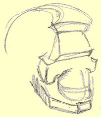 Let's start applying this to faces and heads - because you'll be drawing these yourself here very soon. (A simplified version that I hope will instill you a real sense of volume.) We're now going to look at a series of pictures, all of them blockheads. "Blockheads" are faces and heads made of mostly cuboid shapes - not stupid people. You get to do the same thing you've been doing: envision the vanishing points wherever in space they may be. Draw lines off the two edges of any plane and you'll get a feel for where the vanishing point is.