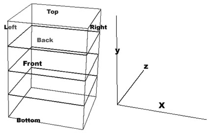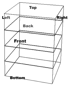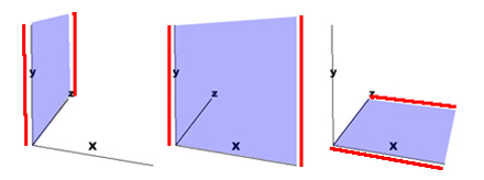 An actual plane is marked off by any two axiis. For instance, you can imagine the plane of the left side of the cube formed by intersecting the y and z axiis. Pretend there's a saran wrap, or better yet, a table cloth pulled tight over the plane formed by any two axiis. Look at the mini-picture at the left in the picture just below as an illustration - it'll be the plane formed by the intersection of the y and z axiis: