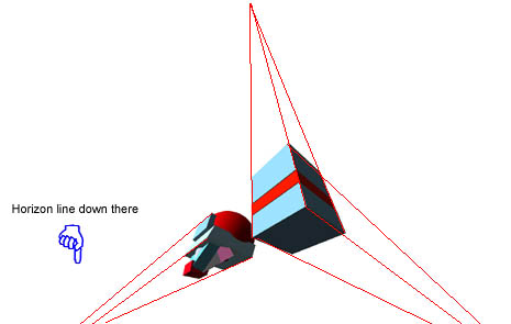 If you're looking up or down on an object, I want you to ask "where is this object in relation to the horizon line (and thus in relation to me)?" Remember, the horizon line, when you're standing on the ground is at your eye level. If you're looking down on something, it's automatically below the horizon? If you're looking up at it, it's above the horizon line, Right? Let's look at some blockheads. In this picture, can you find the vanishing points for the the main cube shapes? (Don't worry about the spherical part of the head and don't worry if your vanishing points don't line up on the horizon line. Just draw lines off these edges to their logical ends - they'll go up, down, left and right):