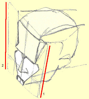an inaccuracy in this picture - can you A: If what's closer to you, the viewer, means that object will appear bigger than the same object a distance away, then the rectangle framing the blockhead above ought to have as it's longest edge the one closest to you. Compare the two vertical edges of the plane's paralleled in red here in this picture (line 1 should be longer than line 2 since it's closer to you; viewed straight on, the side of this face closest to line 1 would be unnaturally small):